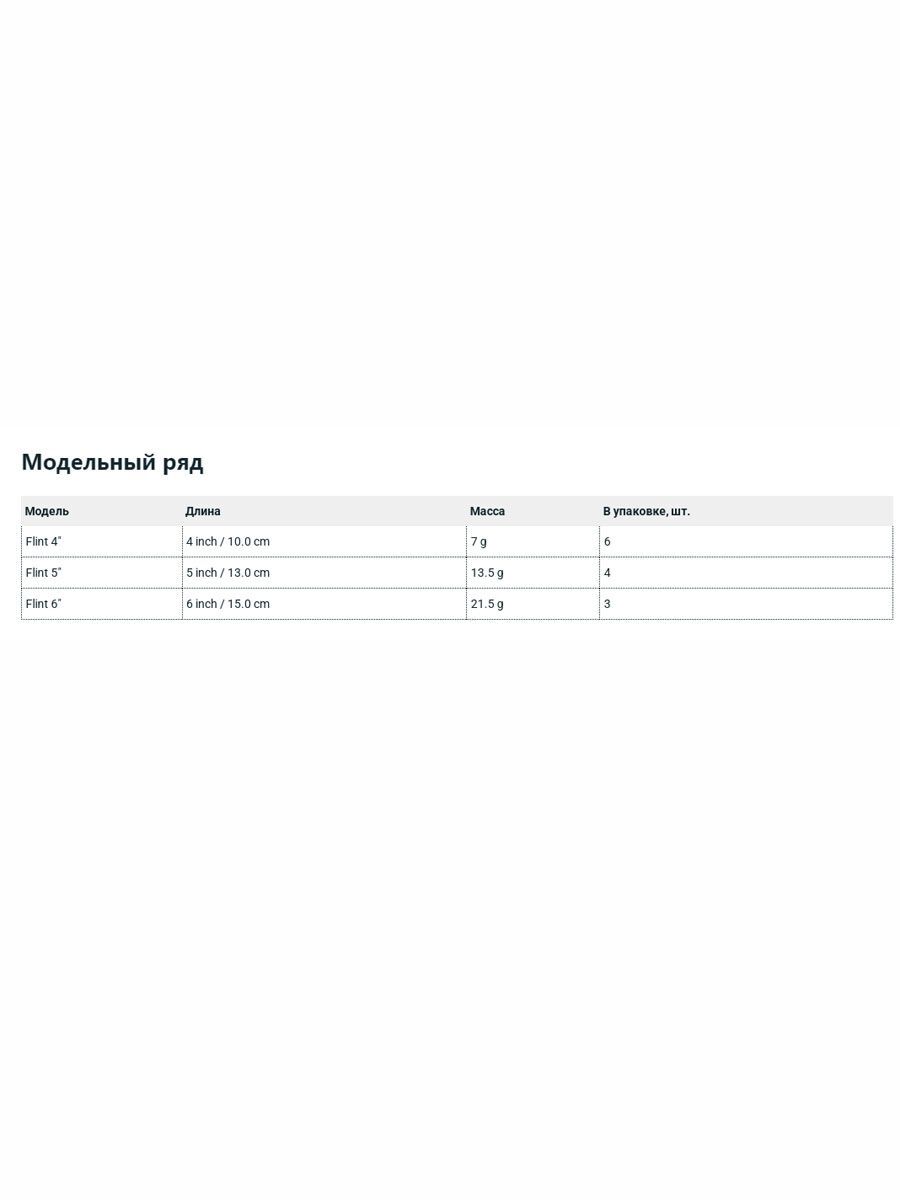 Flint — универсальная модель средне-крупных размеров с достаточно объемным сегментированным телом формы «Shad» и оригинальной рубленой «пяткой» в форме вытянутого сверху вниз пятиугольника.