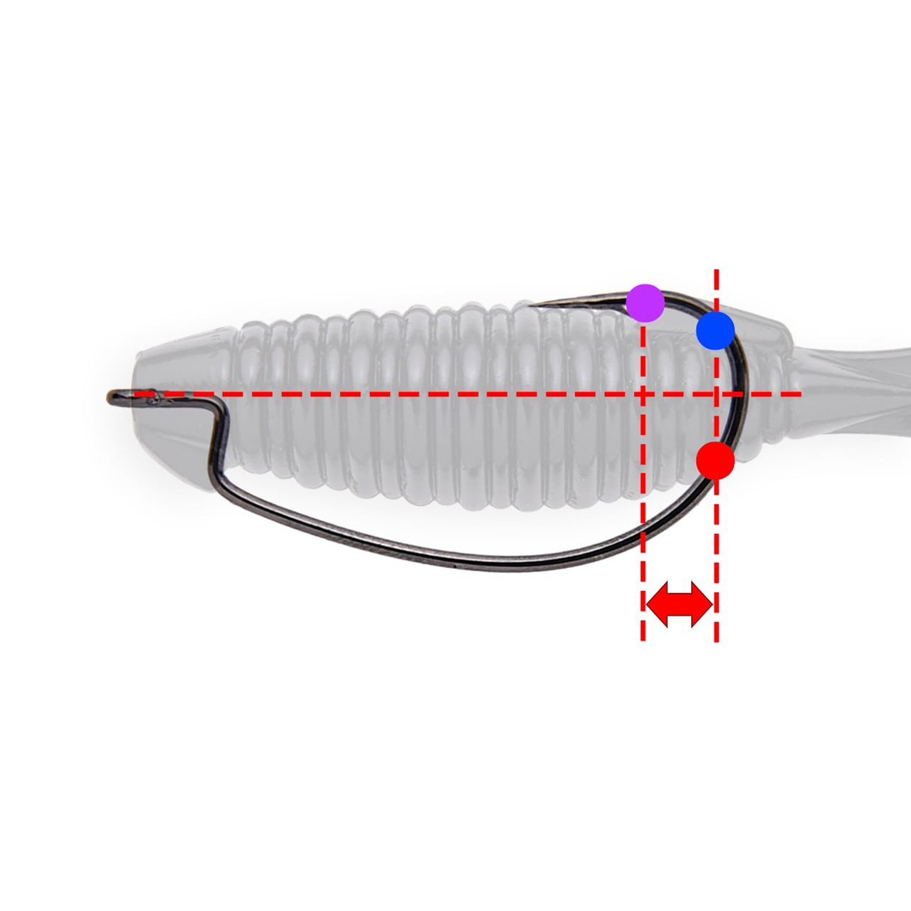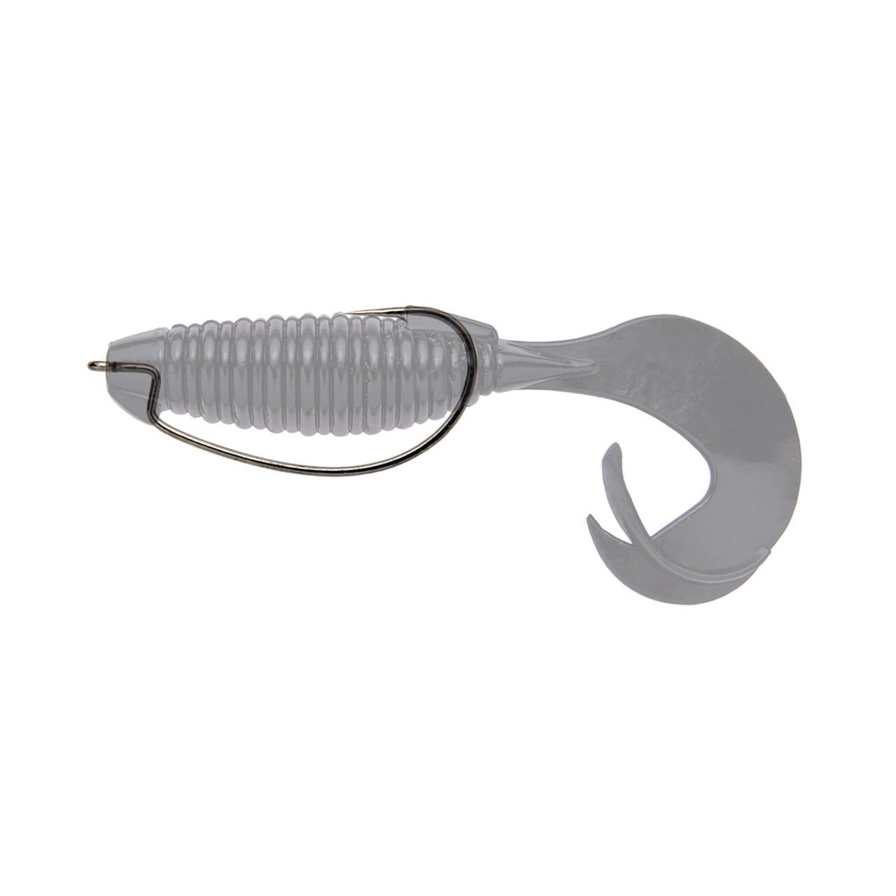Крючки, которые выглядят как небольшие плавники, надёжно удерживают офсетный крючок внутри тела твистера. Это значительно увеличивает срок службы приманки и предотвращает её сползание.