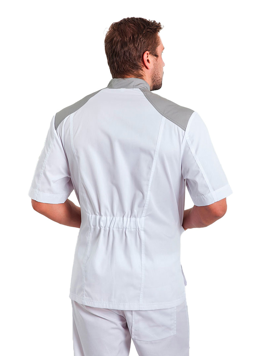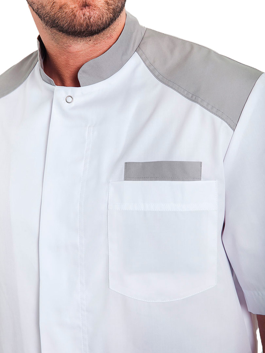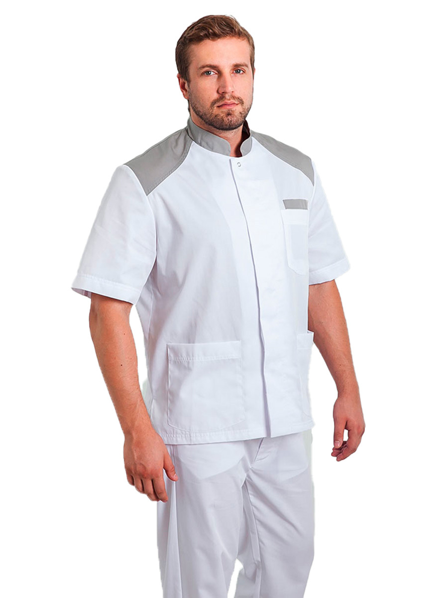 Мужской медицинский блузон "Алексей" полуспортивного фасона с коротким рукавом и воротником стойкой не будет сковывать ваши движения и поможет чувствовать себя комфортно весь день. Данная модель застегивается спереди на металлические кнопки и имеет два нагрудных кармана, два накладных, а также боковые разрезы.