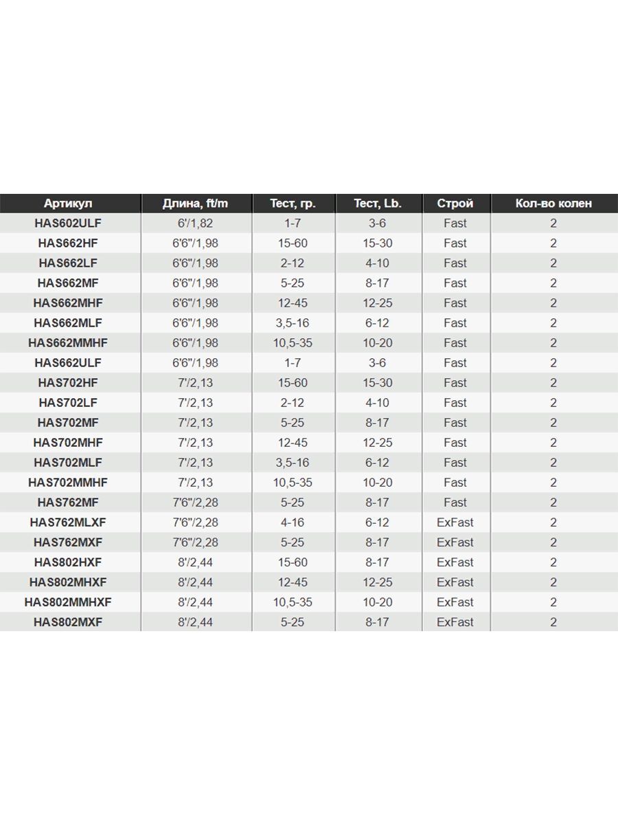 Специализация: модели Harrier со строем Extra Fast прежде всего ориентированы на ловлю джигом. Модели со строем Fast позволяют одинаково хорошо манипулировать приманками всех типов; среди них короткие модели (до длины 7’6”футов, 2.28 м) наиболее актуальны для анимации рывковых воблеров, тогда как более длинные являются максимально универсальными.