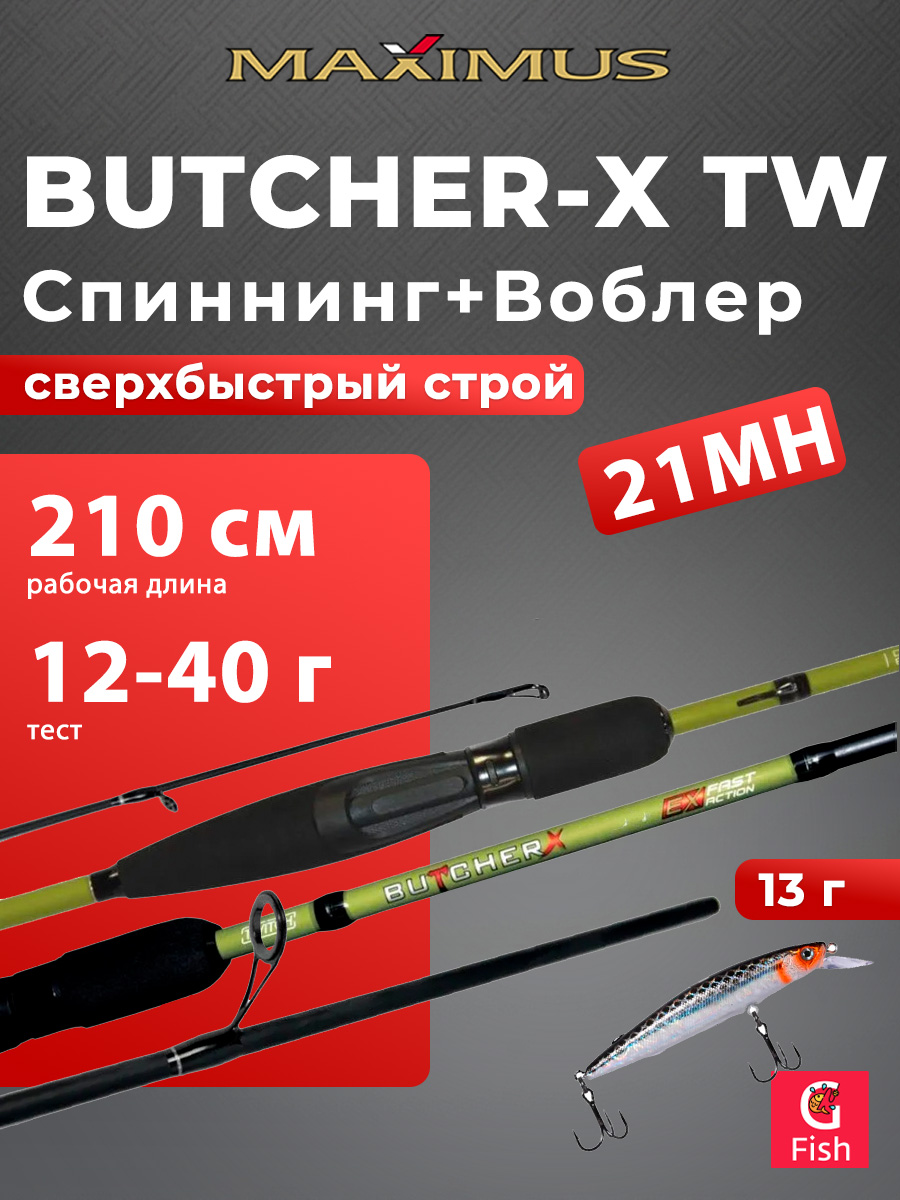Спиннинг для рыбалки Maximus BUTCHER-X TW 21MH 2,1m 12-40g + Воблер LureMax RATRI 102SPMR-196, 13 гр., суспендер