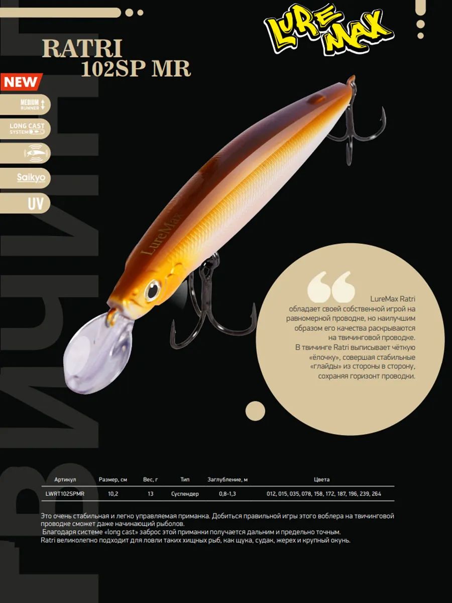 Воблер LureMax RATRI 102SPMR-196, 13 гр., суспендер