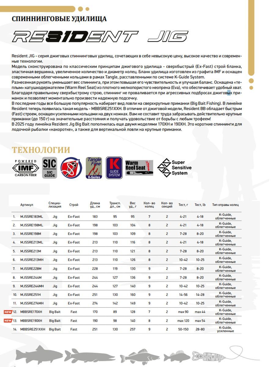 В последние годы все большую популярность набирает вид ловли на сверхкрупные приманки (Big Bait Fishing). В линейке Resident теперь появилась такая модель — MBBSRE251XXH. В отличие от джиговой модели, Resident BB обладает быстрым (Fast) строем, оснащен усиленными кольцами на двух ножках.