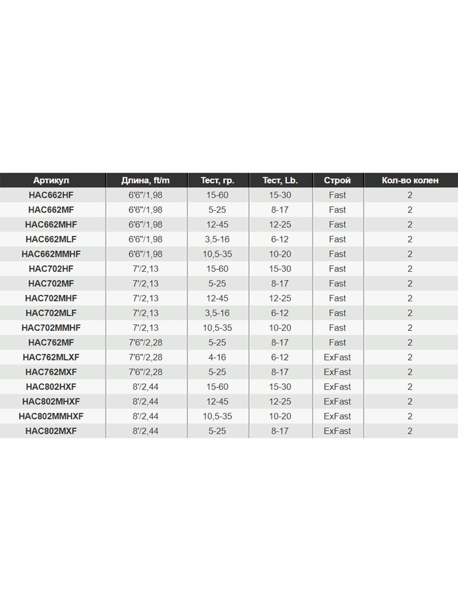 Специализация: модели Harrier со строем Extra Fast прежде всего ориентированы на ловлю джигом. Модели со строем Fast позволяют одинаково хорошо манипулировать приманками всех типов; среди них короткие модели (до длины 7’6”футов, 2.28 м) наиболее актуальны для анимации рывковых воблеров, тогда как более длинные являются максимально универсальными.