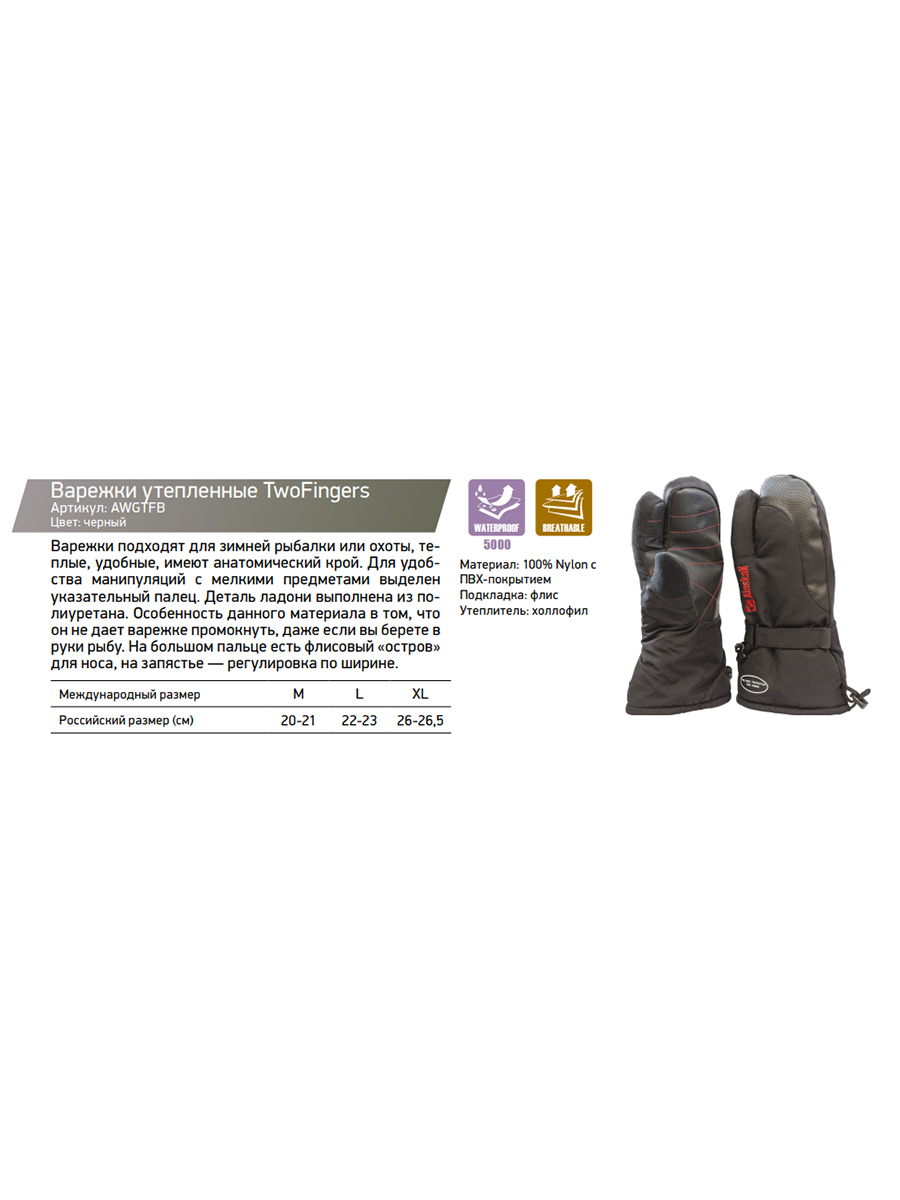 Варежки ALASKAN - идеальный выбор для любителей активного отдыха на природе. Эти варежки обеспечат вам комфорт и защиту в холодные зимние дни. Прочный и надежный дизайн гарантирует долгий срок службы изделия. Удобная посадка и эргономичная форма позволяют свободно двигать пальцами и не ограничивают движения. Варежки ALASKAN отлично подходят для занятий зимними видами спорта, таких как лыжи, сноуборд, катание на санях. Они защитят ваши руки от холода, ветра и влаги, обеспечивая тепло и комфорт даже в самых суровых погодных условиях. Подкладка из мягкого и теплого материала обеспечивает дополнительный уровень комфорта. Варежки ALASKAN - надежный и стильный аксессуар, который станет незаменимым спутником в ваших зимних приключениях. Варежки утепленные Alaskan TWO FINGERS. Водостойкость: 5000 мм. Материал: Nylon с ПВХ покрытием. Подкладка: флис. Утеплитель: Hollofil. Отличные варежки для зимней рыбалки или охоты, теплые, удобные, имеют анатомический крой. Для удобства манипуляций с мелкими предметами выделен указательный палец. Деталь ладони выполнена из полиуретана. Особенность данного материала в том, что он не даст варежке промокнуть, даже если Вы берете в руки рыбу. На большом пальце есть флисовый «остров» для носа, на запястье - регулировка по ширине.