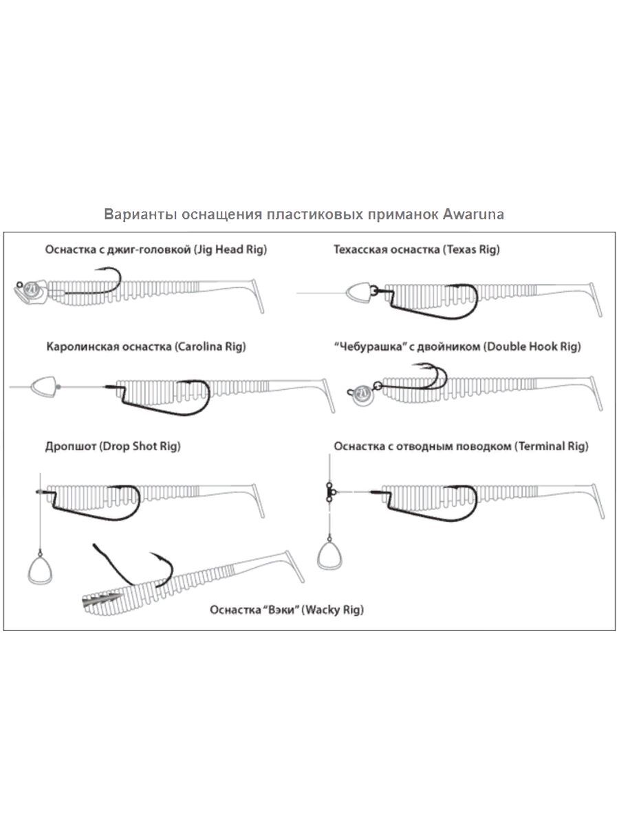 Виброхвосты Awaruna имеют одну немаловажную конструктивную особенность, выгодно отличающую их от виброхвостов других производителей. В теле приманки строго по центру расположено отверстие, позволяющее насаживать ее на джиг-головку или на двойник идеально ровно. Кроме того, небольшой пазик на спине позволяет спрятать жало офсетника, обеспечивая приманке свойства "незацепляйки".