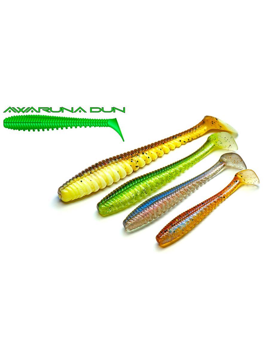 – «Пятка» хвоста DUN, отклоняясь под воздействием потока воды на угол, отличающийся от рабочего угла пятки EVO, движется свободно и достаточно энергично, чтобы тело сохраняло своё змеевидное движение при любой огрузке. Тип колебаний и водных возмущений Awaruna DUN отличаются от производимых Awaruna EVO, что обеспечивает вам большее разнообразие опций для успешной рыбалки