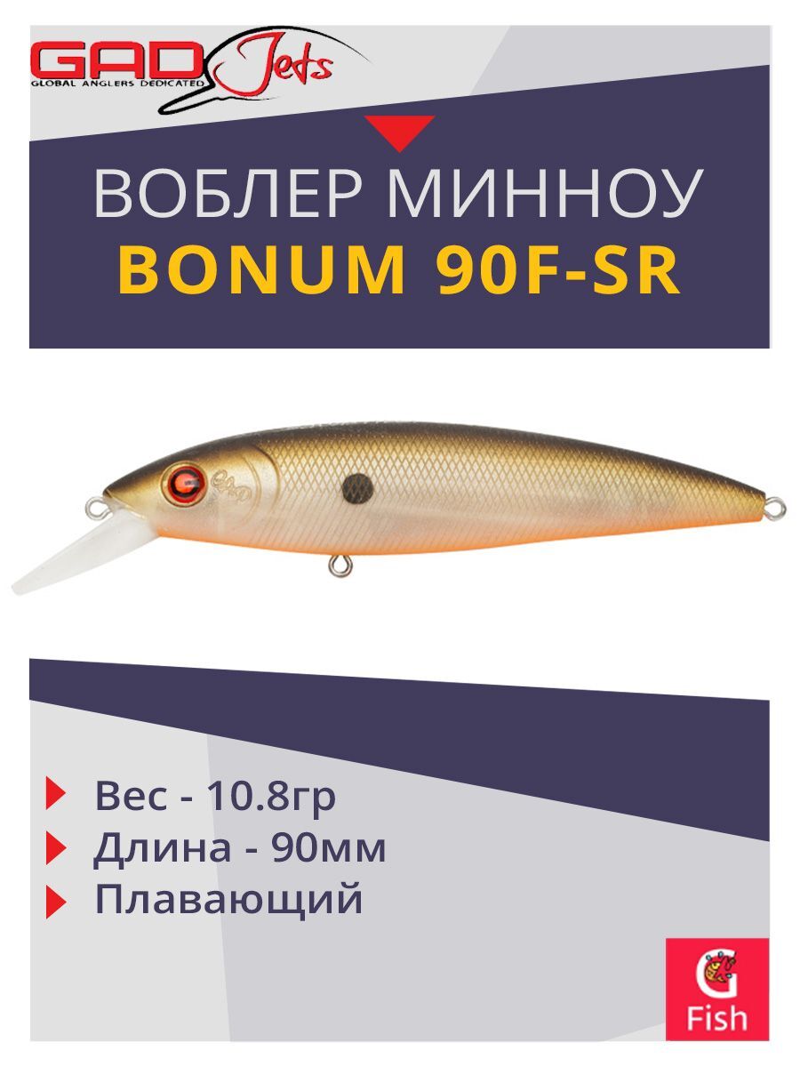 GAD Jets Bonum – объёмный, активно играющий щучий воблер минноу. Выпускается в трёх размерах: 75, 90 и 105 мм, и в двух модификациях: suspend (SP) с нейтральной плавучестью и floating (F) плавающий.