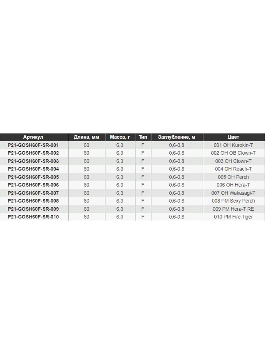 Для того, чтобы GAD Gosh ходил аккуратными галсами из стороны в сторону, достаточно деликатных движений кончиком удилища или даже аккуратной анимации катушкой. Ведь качественный Rolling (колебания вокруг продольной оси приманки) и возможность деликатного твичинга изначально заложены в конструкцию приманки. GAD Gosh способен разворачиваться буквально на одном месте, переваливаясь с боку на бок. Очень эффективной при ловле щуки бывает и простая равномерная проводка GAD Gosh. Особенно она уместна, если вы ловите щуку на торфяниках – каналах или затопленных «картах». Применяя GAD Gosh, можно действовать по следующей схеме. Сначала достаточно быстрой равномерной проводкой или Stop-and-Go можно оперативно «пробить» акваторию. А при обнаружении щуки – ее поклевок или «выходов» – хищницу можно «доловить» деликатным твичингом. Правда, как показывает практика, при высокой активности щуки нет нужды переключаться на рывковую проводку. GAD Gosh отлично ловит хищницу и на простой равномерной. GAD Gosh выпускается в двух размерах (60 и 70 мм), и двух вариантах плавучести – плавающий и с нейтральной плавучестью (Suspender). Приманки оборудованы острейшими тройниками Pontoon21 Trivalent Vistpoint Trebles TVT28. На заметку: Многие «профи» считают приманки с матовой поверхностью наиболее универсальными и уловистыми как в максимально прозрачной, так и в мутной воде. Так, в воде торфяных карьеров, затопленных «карт» и каналов очень часто «первым номером» выступают воблеры с матовым покрытием. В ассортименте воблеров GAD Jets это, прежде всего, яркие окраски, имеющие матовую поверхность 008 PM Sexy Perch и 010 PM Fire Tiger, а также «секретная натуральная» окраска 009 PM Hera-T RE. Эта окраска очень хорошо имитирует молодь карпа, карася, линя. И, вдобавок ко всему, благодаря матовому покрытию воблер цвета 009 PM Hera-T RE щука замечает достаточно далеко даже в воде с малой прозрачностью. Длина: 60 мм Масса: 6.3 г Плавающий (F) Заглубление: 0.6-0.8 Цвет 010