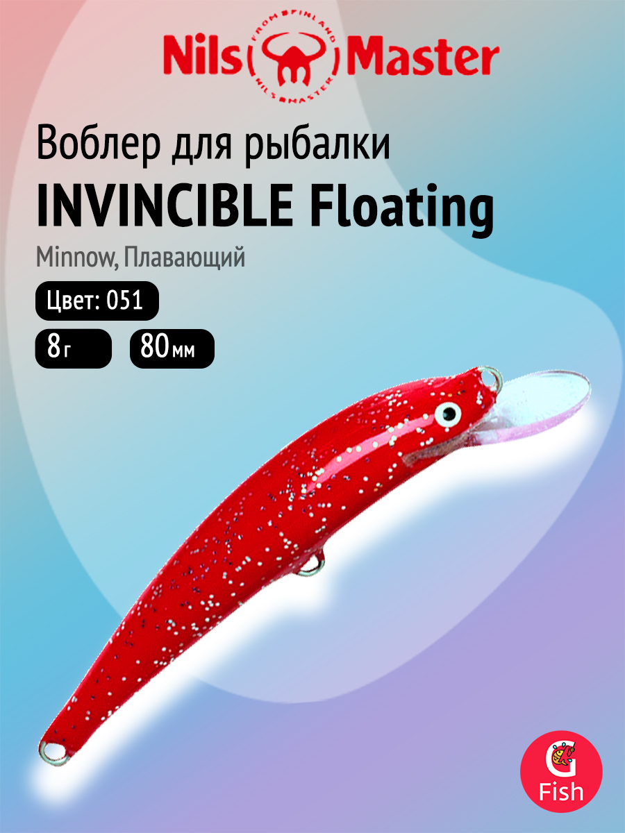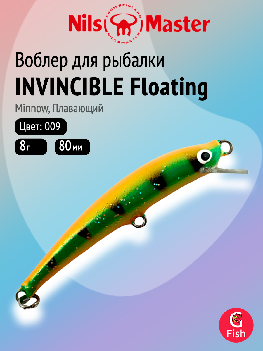 Модель Nils Master Invincible Floating имеет слегка изогнутую форму, что создаёт ее революционную игру. Как видно из названия (Invincible – «непобедимый»), этот воблер – один из самых опытных ловцов рыбы. Уникальная игра приманки и её удачные расцветки помогли многим рыболовам по всему миру поймать рекордное число больших рыбин. Глубина проводки 6