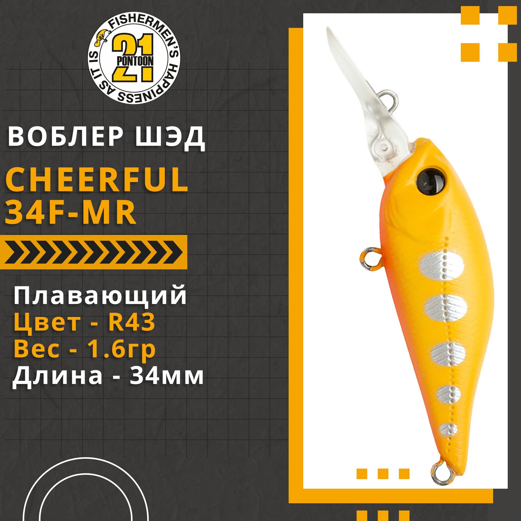 Cheerful – воблер, с которого началась история Pontoon21. Стоило появиться одной-единственной модели, маленькому шэду (shad) Cheerful 40, как имя Pontoon21 мгновенно стало широко известным. Юркий маленький воблерок ловил всё и везде, не заваливаясь на самом быстром течении, отлично удерживаясь в любых водоворотах и оставаясь привлекательным при любой анимации как на течении, так и в спокойной воде. Cheerful 40 и сейчас чувствует себя прекрасно, а в его "послужном списке" присутствуют практически все хищники, обитающие в наших водах. Найдётся не так уж много моделей, которые остаются в коллекциях компаний и в коробках рыболовов столь долгий срок, будучи по-прежнему востребованными и популярными. По мнению абсолютного большинства рыболовов, специализирующихся в легком спиннинге, эта серия небольших воблерков по праву может считаться одной из лучших для ультралайтовой ловли. Уплощенной с боков формой тела Cheerful предельно точно имитируют мальков высокотелых видов рыб и отличаются достаточно необычной, специфической игрой. Внутренняя балансировочная система, состоящая из трех разнесенных внутри тела подвижных вольфрамовых шариков, обеспечивает приманке оптимальное расположение не только при забросе, но и в воде во время проводки.