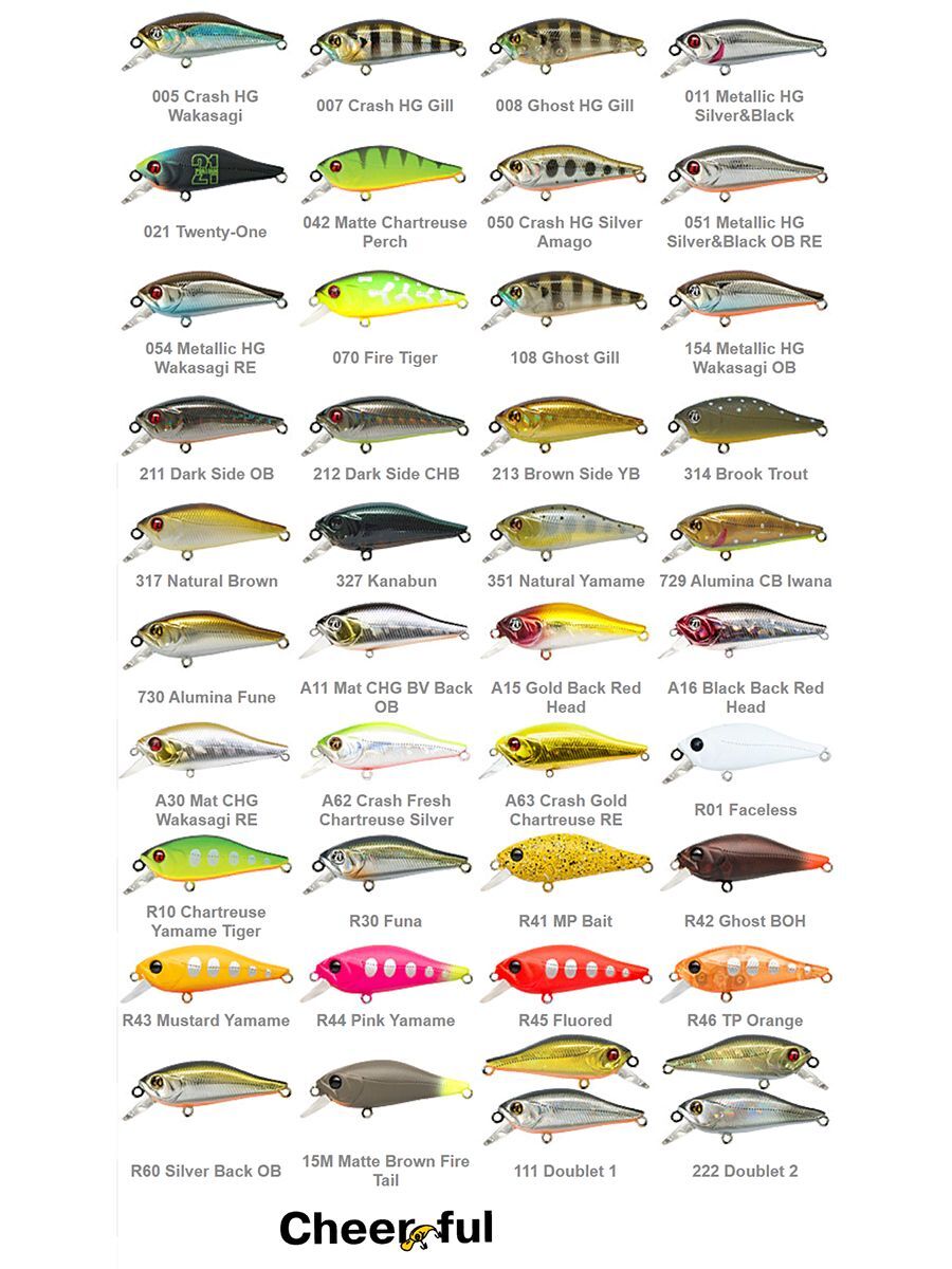 Cheerful длиной 60 мм унаследовал все лучшие качества своего прародителя и рассчитан по своему размеру уже на весьма солидные трофеи. Игра очень активна, сочетает явно выраженные поперечные колебания (wobbling) со столь же яркими и акцентированными поворотами тела вправо-влево относительно продольной оси (rolling). Эта комбинация достигнута выверенным контуром и внутренним балансом. Металлические балансировочные шарики подрагивают при движении, добавляя к игре приманки дополнительные штрихи и сопровождая её лёгким привлекательным звуком.