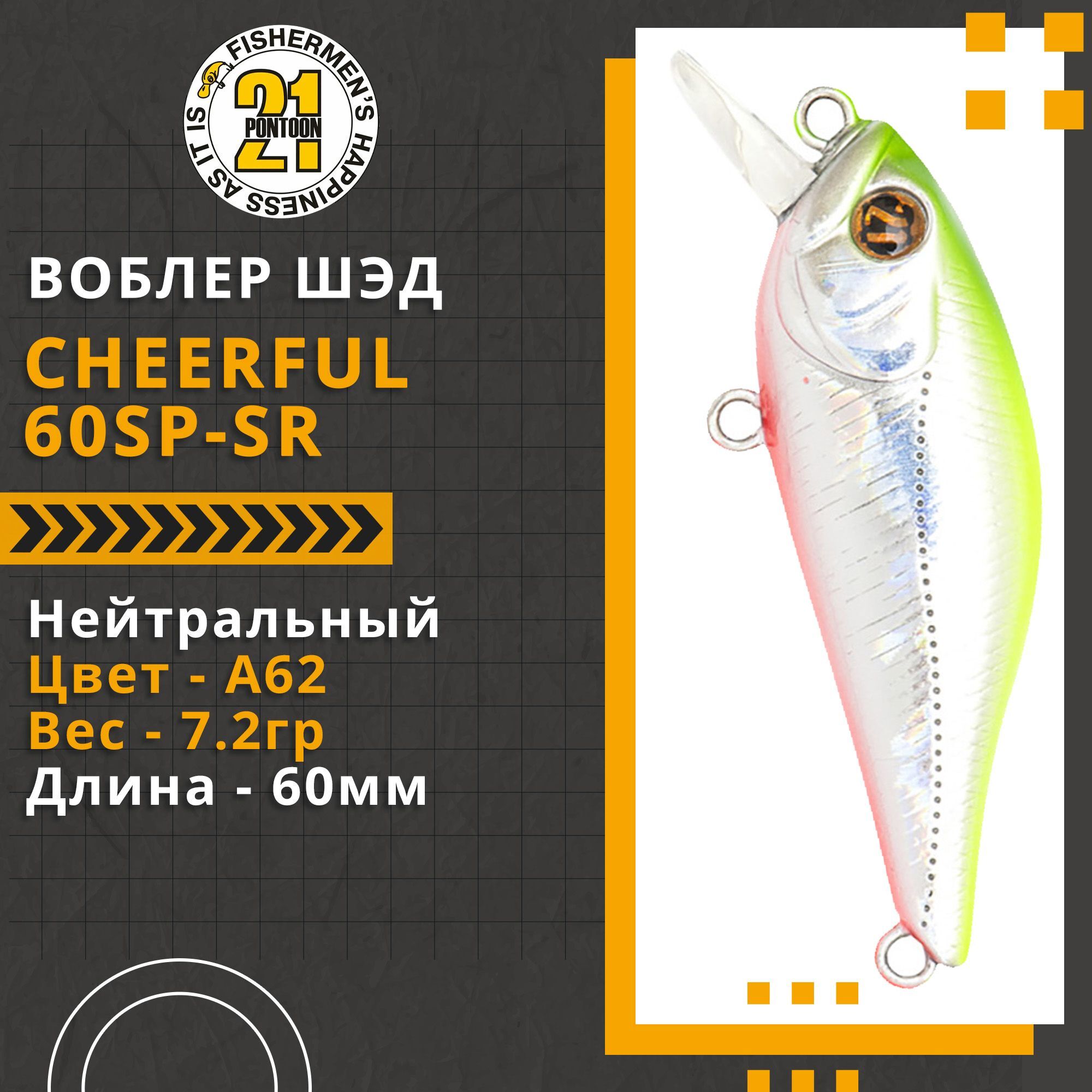 Cheerful – воблер, с которого началась история Pontoon21. Стоило появиться одной-единственной модели, маленькому шэду (shad) Cheerful 40, как имя Pontoon21 мгновенно стало широко известным. Юркий маленький воблерок ловил всё и везде, не заваливаясь на самом быстром течении, отлично удерживаясь в любых водоворотах и оставаясь привлекательным при любой анимации как на течении, так и в спокойной воде. Cheerful 40 и сейчас чувствует себя прекрасно, а в его "послужном списке" присутствуют практически все хищники, обитающие в наших водах. Найдётся не так уж много моделей, которые остаются в коллекциях компаний и в коробках рыболовов столь долгий срок, будучи по-прежнему востребованными и популярными. По мнению абсолютного большинства рыболовов, специализирующихся в легком спиннинге, эта серия небольших воблерков по праву может считаться одной из лучших для ультралайтовой ловли. Уплощенной с боков формой тела Cheerful предельно точно имитируют мальков высокотелых видов рыб и отличаются достаточно необычной, специфической игрой. Внутренняя балансировочная система, состоящая из трех разнесенных внутри тела подвижных вольфрамовых шариков, обеспечивает приманке оптимальное расположение не только при забросе, но и в воде во время проводки.