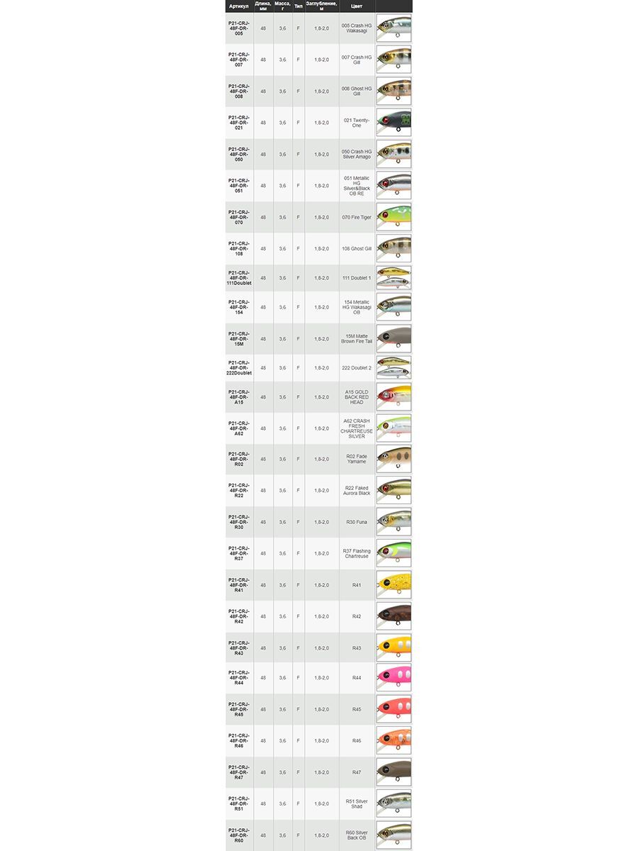 Воблер имеет две степени плавучести – плавающий F (Floating) и суспендер SP (suspend). Каждая из них имеет три варианта заглубления: с минимальным заглублением SR (Shallow Runner), со средним заглублением MR (Medium Runner), глубоководный DR (Deep Runner). В зависимости от модификации масса воблера варьирует от 3,1 до 3,6 грамма. CrackJack 48 по своей геометрии принадлежит к классу воблеров-шедов.