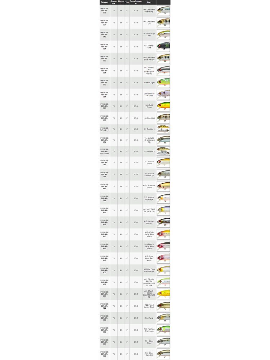 Каждая из шести модификаций CrackJack 78 обладает индивидуальными особенностями, что позволяет рыболову успешно охотиться за хищником на озерах, водохранилищах и реках. Все они отлично работают на течении, не сбиваются и не заваливаются на бок. Три степени заглубления помогают облавливать горизонты от 0,5 до 3,0 метров. А в эти рамки попадает львиная доля береговых рыбалок и до половины лодочных, если рассматривать привычные условия средней полосы России.