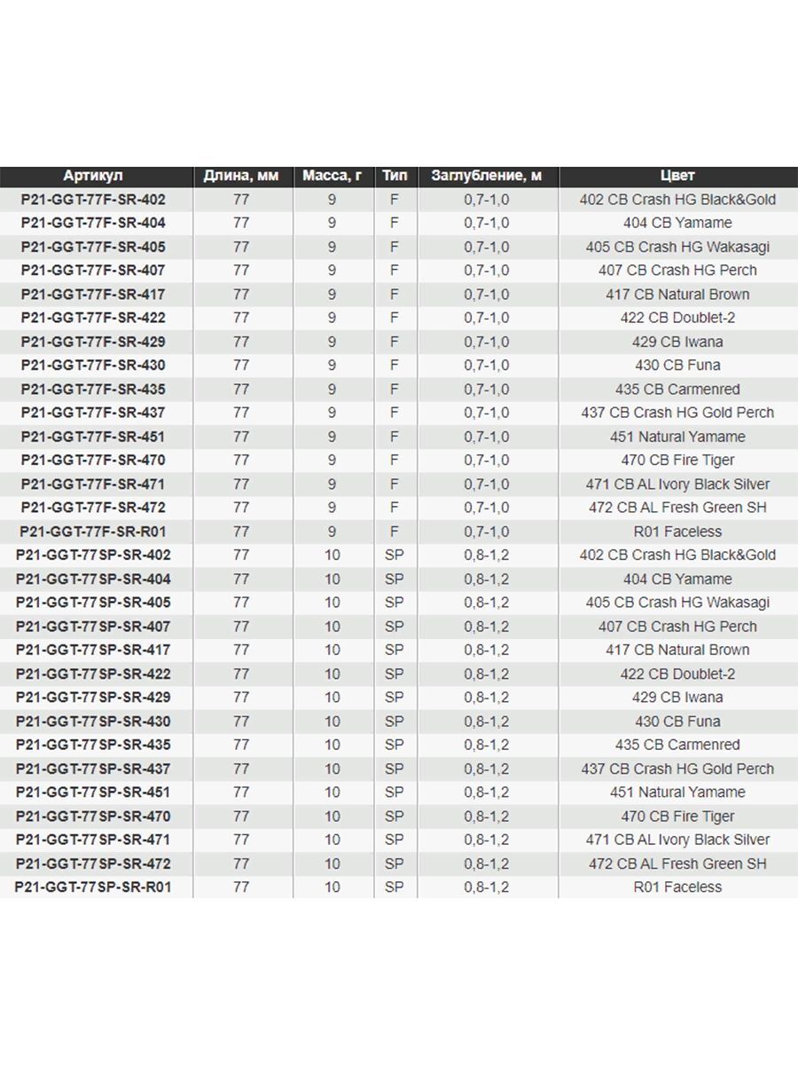 Серия включает несколько размерных модификаций (44, 55, 66, 77, 88, 99 и 111 мм), выполненных в двух вариантах плавучести – нейтральной (suspending) и в плавающей (floating). Кроме того, любой из воблеров GreedyGuts (независимо от размера и плавучести) имеет мелкозаглубляющуюся (SR) и среднезаглубляющуюся (MDR) версии.