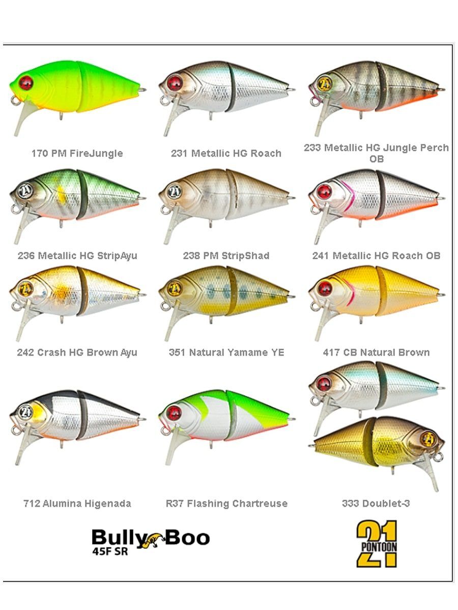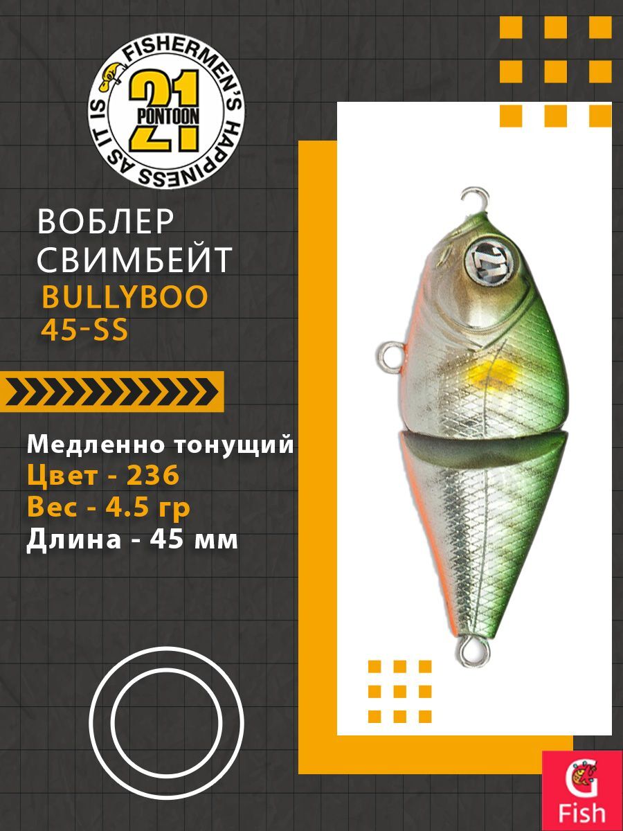 Bully Boo – первый составной воблер от Pontoon21, разработка которого продолжалась более полутора лет. Данная серия появилась сразу в двух версиях: одна – плавающая, с заглубляющей лопастью, вторая – медленно тонущая, безлопастная. Плавающий Bully Boo – мелководный воблер с рабочим горизонтом действия до полуметра. Это высокотелая, прекрасно сбалансированная, очень подвижная приманка, способная создавать разнообразные движения в различных плоскостях и направлениях.