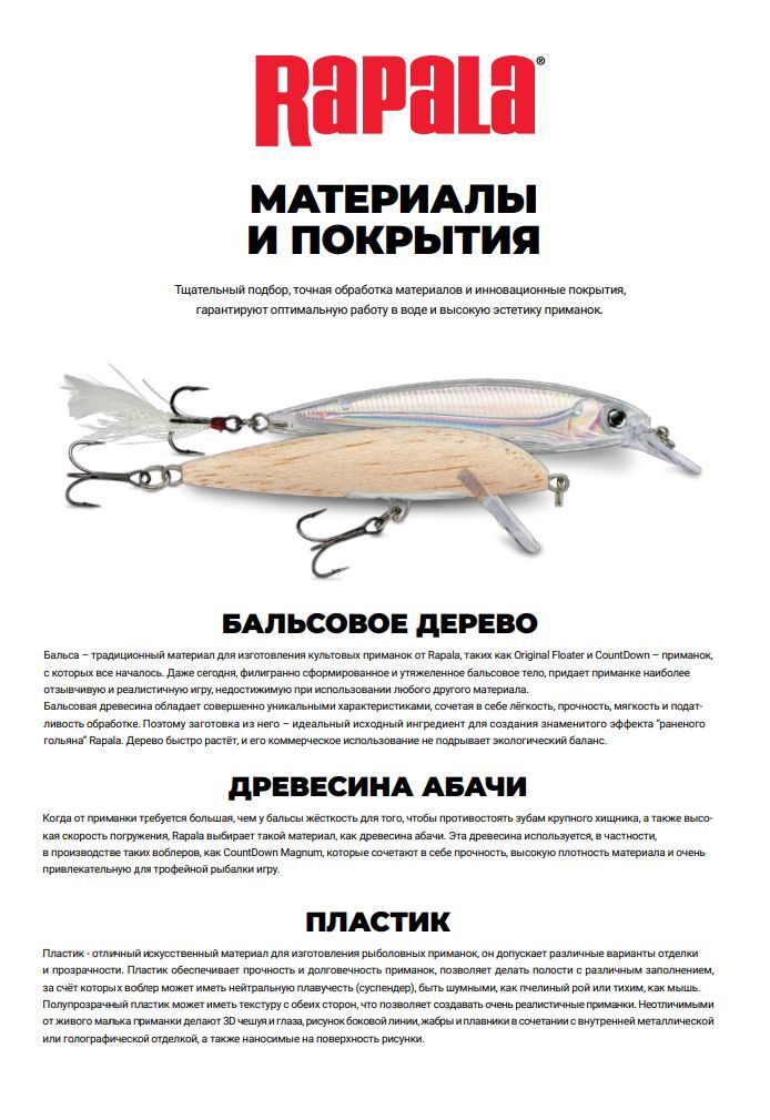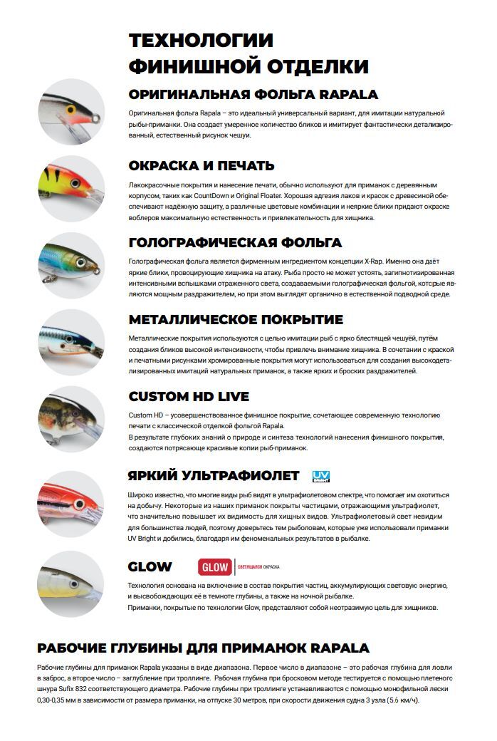 Частый мелкий или резкий «твичинг», агрессивная подача или равномерная проводка в быстром темпе обеспечивают приманке много бликов и схожесть с движениями раненой мелкой рыбки, пытающейся убежать от хищника. Это фирменная игра воблеров Rapala.