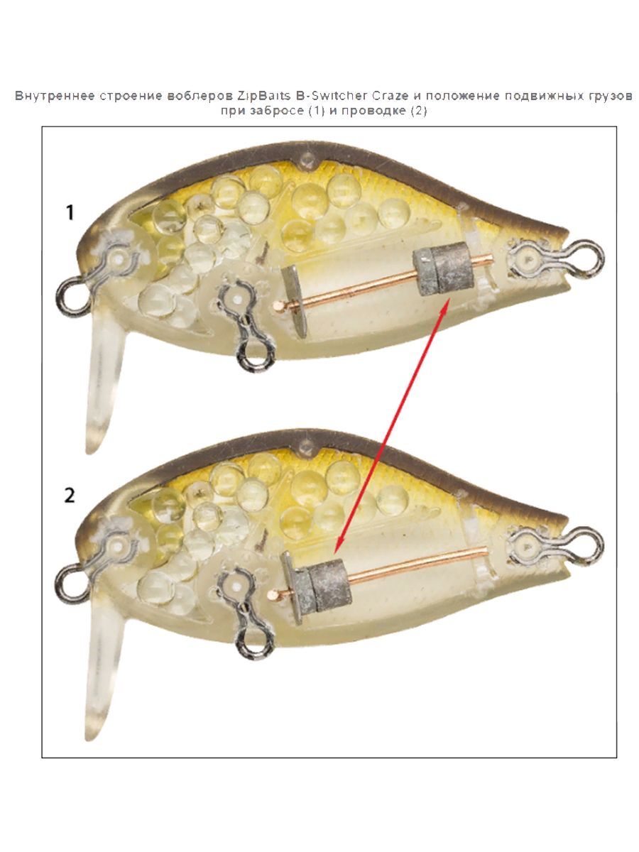 Штифт, по которому движется вольфрамовый цилиндр, расположен под углом. Таким образом, при забросе груз уходит не просто к хвосту, но и вверх по телу, что при наличии нижней огрузки очень хорошо центрирует воблер относительно оси – и он не входит в штопор при забросе. С началом проводки наклон штифта ускоряет движение цилиндра к рабочему положению (где он фиксируется магнитом), что при такой длине тела даёт выигрыш во времени. То есть воблер, несмотря на большой размер, «заводится» сразу, и его движения из стороны в сторону при твичинге можно сделать более выраженными и резкими.