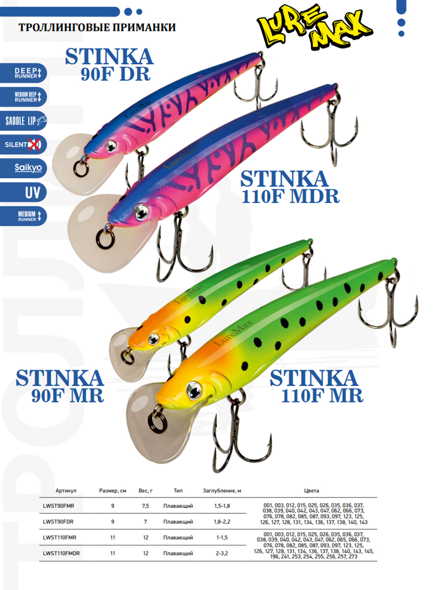 Воблер с седловидной лопаткой специально разработан для троллинга судака, озерной кумжи и лосося. Благодаря форме носовой лопасти и специальной балансировке, Stinka при проводке время от времени совершает броски в сторону, что провоцирует лососевых рыб на поклевку. Воблер «тихий» и не настораживает рыбу стуком металлических шариков, что бывает особенно важно при ловле осторожной рыбы. Приманка продемонстрировала хорошие результаты на водоемах Северо-Запада России.