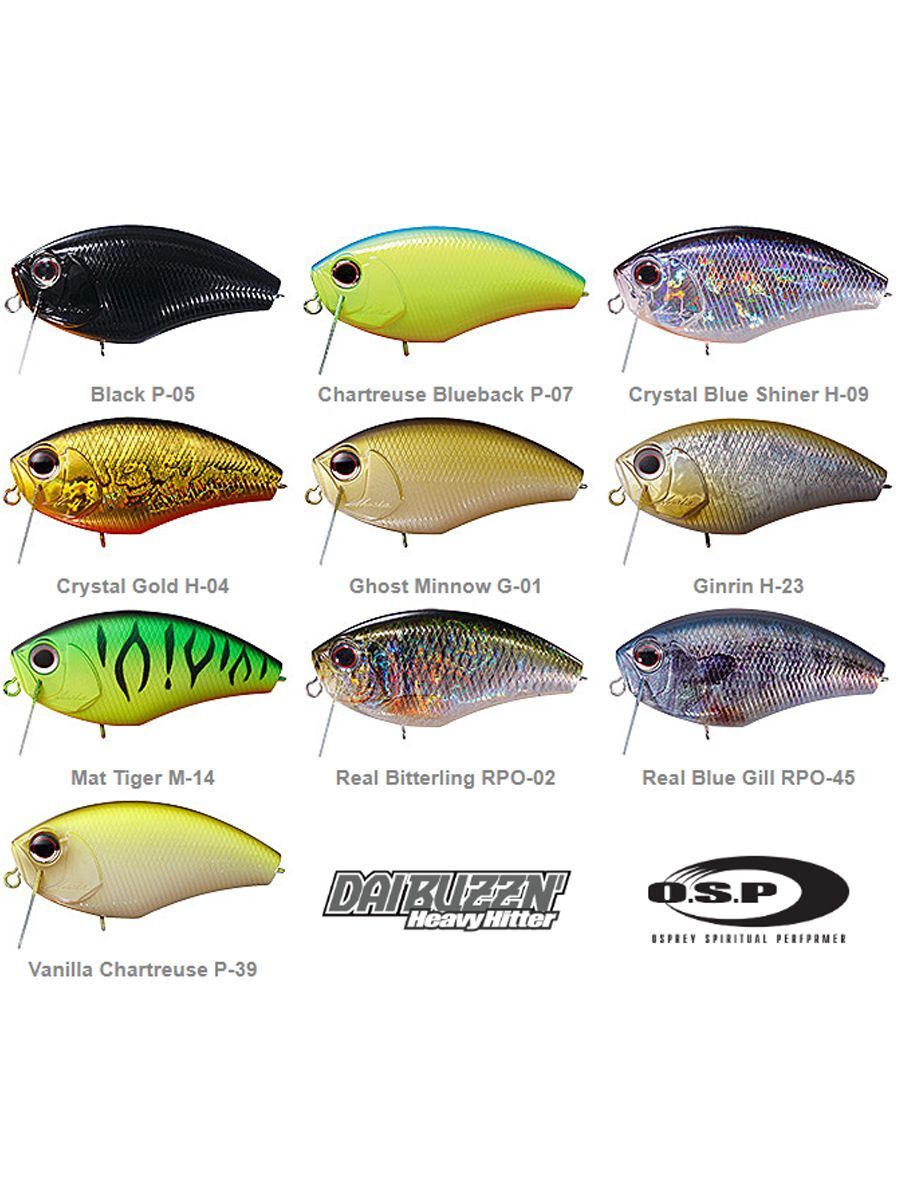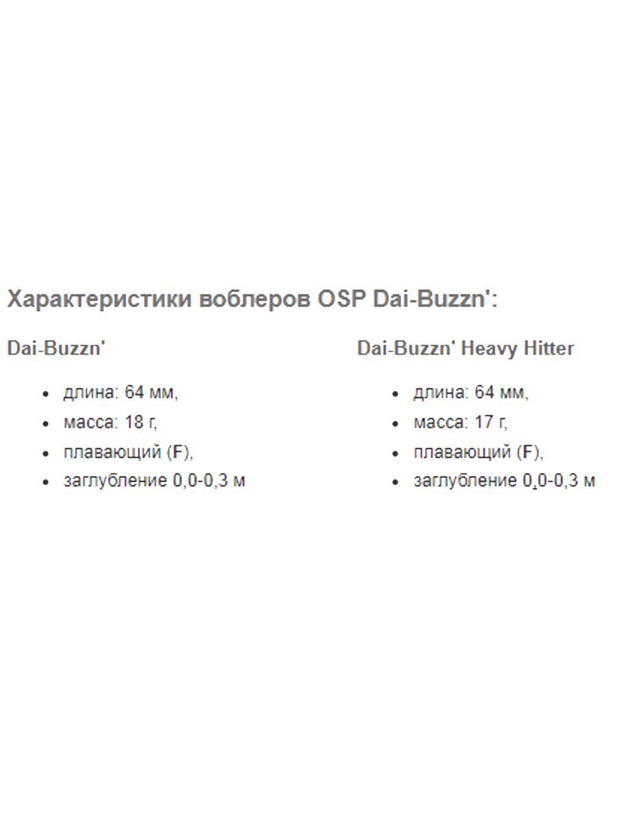 Dai-Buzzn’ – крэнк, размер которого кажется крупным для обычных супер-мелководных моделей данного класса. Дело в том, что он создан для условий, в которых более мелкие приманки малозаметны для хищников в силу турбулентности воды или множества препятствий, мешающих распространению колебаний. Крупный поверхностный крэнк Dai-Buzzn’ сконструирован так, что мощность распространяемых им колебаний удвоена, так как зависит не только от размеров тела, но и благодаря внутренней конструкции.