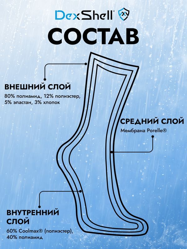 —Главный функциональный слой — мембрана Porelle®, которая производится в Англии. Именно она делает носки DexShell водонепроницаемыми, и главное — отвечает за эффективное потоотведение. Работает эластичная и прочная мембрана Porelle® благодаря разнице температур внутри и снаружи носка, именно поэтому не рекомендуется надевать носки Dexshell поверх обычных.